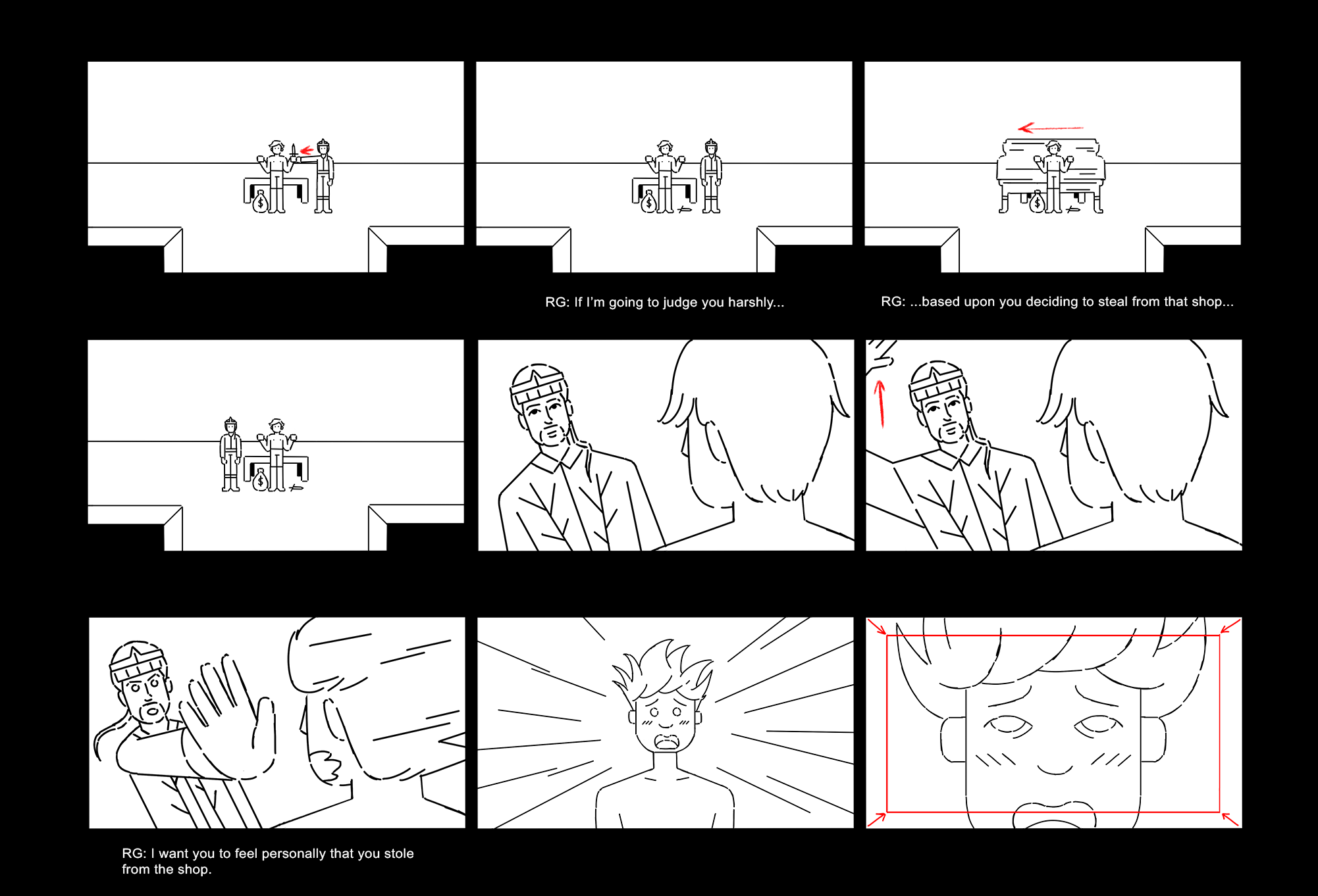 This scene is about Jim Riley and the development of Night Trap. Hasbro was concerned that the game may feature “reproducible violence.” After much deliberation, they agreed on featuring creatures called “Augers”, who limp slowly with blood-draining devices. Ironically, Night Trap ended up being scrutinized in the 1993 Congressional hearings for video game violence.